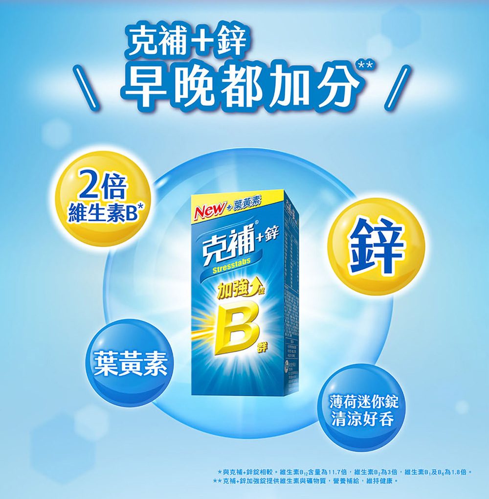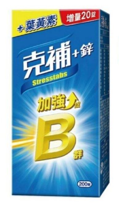 克補+鋅: 抗壞血酸(維生素C)97%(維生素C、羥丙基甲基纖維素)、微結晶狀纖維素、菸鹼醯胺、乙酸dl-α-生育醇酯(維生素E)50%(維生素E、辛烯基丁二酸鈉澱粉、二氧化矽)、鹽酸口比哆辛(維生素B6)33.3%(脂肪酸甘油酯、維生素B6)、硝酸硫胺明(維生素B1)、核黃素(維生素B2)、本多酸鈣、氧化鋅、留蘭香香料16%(麥芽糊精、留蘭香油、辛烯基丁二酸鈉澱粉)、聚乙烯醇、氰鈷胺明(維生素B12)1%[辛烯基丁二酸鈉澱粉、檸檬酸鈉、檸檬酸、二氧化矽、維生素B12]、聚乙烯聚?喀烷酮、葉黃素5%[明膠、蔗糖、玉米澱粉、水、葉黃素、磷酸鈣、生育醇(抗氧化劑)、抗壞血酸鈉(抗氧化劑)、抗壞血酸棕櫚酸酯(抗氧化劑)]、二氧化鈦、滑石粉、生物素1%[磷酸氫鈣(無水)、生物素]、二氧化矽、硬脂酸鎂、食用黃色五號鋁麗基、硫酸銅、卵磷脂、葉酸、玉米糖膠。
