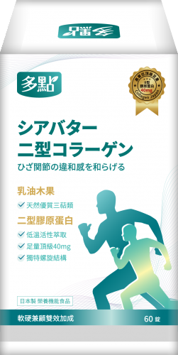 乳油木果萃取、明膠、甲基硫醯基甲烷(二甲碸)、甘油、軟骨素(雞胸軟骨)、非變性第二型膠原蛋白、大豆油、貓爪藤萃取(貓爪藤萃取物、糊精、二氧化矽)、卵磷脂、二氧化鈦、水、黃蜂蠟食用黃色4號、食用紅色40號、維生素D3(膽鈣化醇)