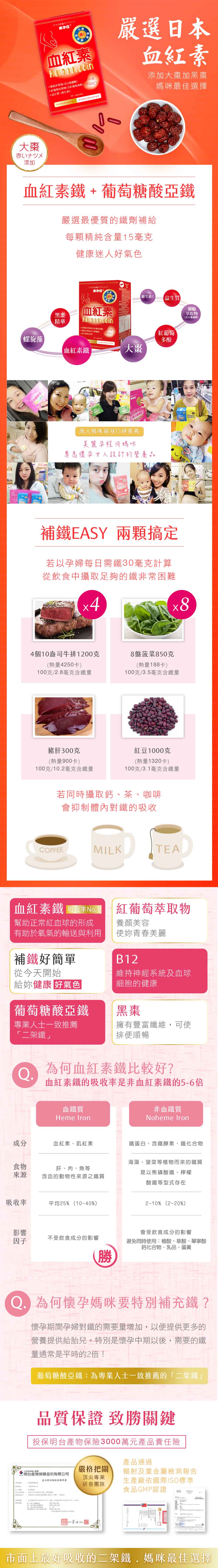 葡萄糖酸亞鐵、血紅素粉(小分子化血紅素(含血紅素鐵;豬來源))、 螺旋藻粉、維生素C(L-抗壞血酸、羥丙基甲基纖維素)、紅葡萄萃取物(含葡萄多酚)、 綜合維生素B群(麥芽糊精、乳糖、維生素B2、維生素B6、菸鹼酼胺、維生素B1、 本多酸鈣、維生素B12、葉酸、生物素)、葡萄萃取物(含白藜蘆醇)、紅棗萃取物 (紅棗萃取物、麥芽糊精)、黑棗萃取物(黑棗萃取物、麥芽糊精)、果寡糖 (葡萄糖、麥芽糖)、菊糖粉、葉酸