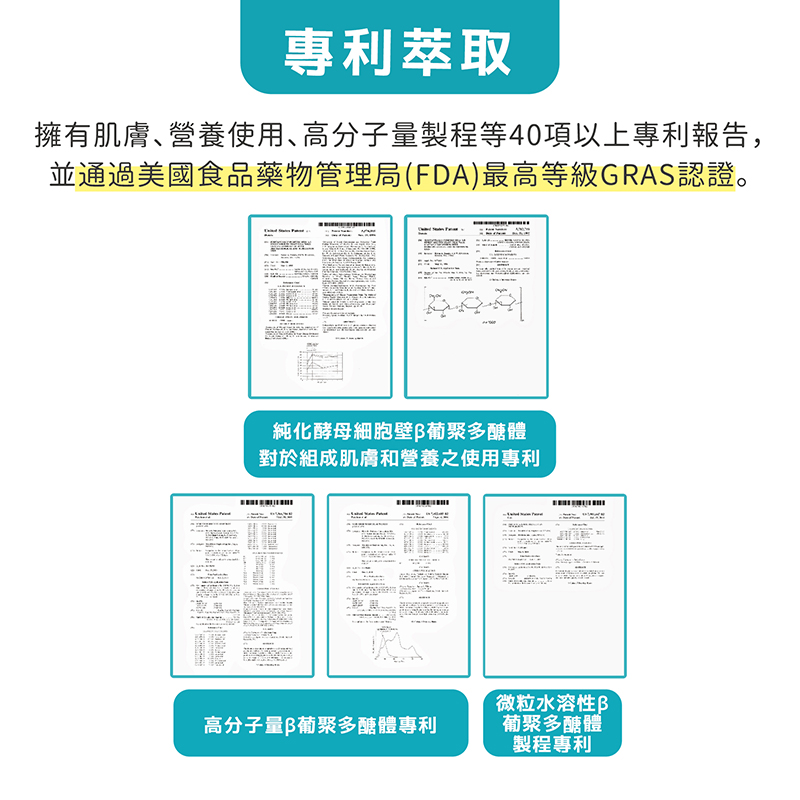 採用美國專利酵母萃取,每粒內含250mgβ-(1,3/1,6)葡聚多醣體含量高達75%,獨特分子結構、專利技術,獲美國多項專利。