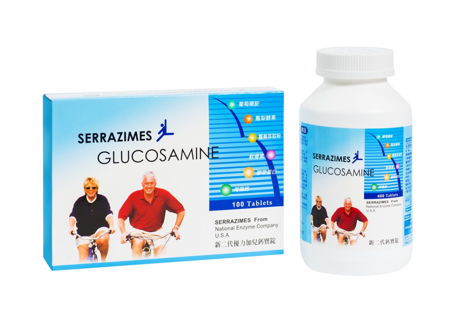 葡萄糖胺鹽酸鹽、早基硫酸基甲烷、膠原蛋白、紅藻萃取(含海藻鈣、鎂)、維生素D3 蛋白質水解酵素、軟骨素、鳳梨酵素、薑黃萃取粉。